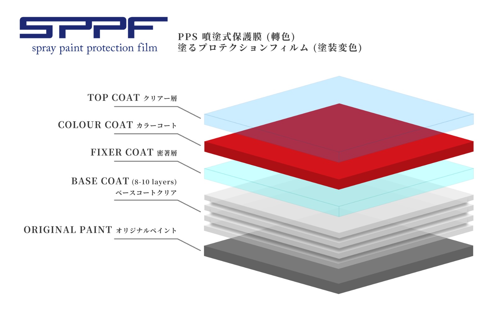 PPS噴塗式保護膜,是目前市場上最強的車身保護產品,能夠提供厚、透明、可拆卸的保護膜,同時還能更換顏色。這款產品由日本製造,特別為亞洲氣候設計,厚度比一般PPF膜更厚,能夠有效保護車身。